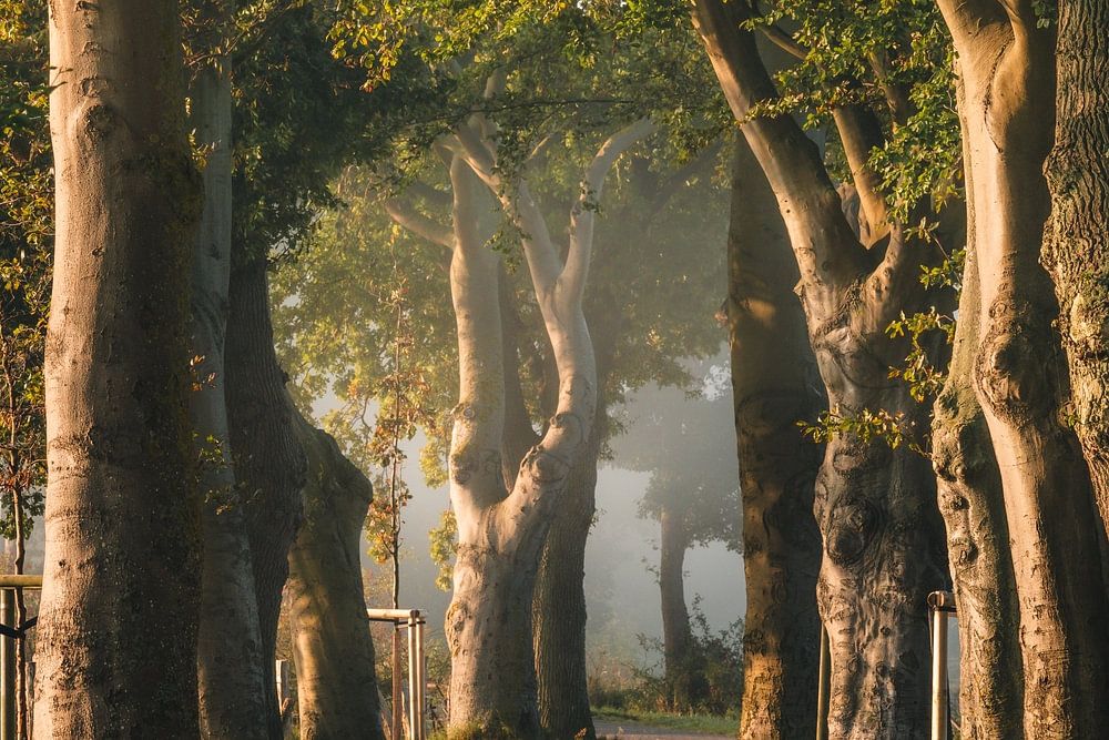 Ochtend met mist en zonsopgang op het eiland Rügen, Mecklenburg-Vorpommern, Duitsland