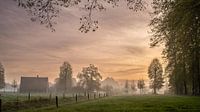 De zon komt net op boven het Twentse land. De lucht kleurt oranje met een vleugje purper.