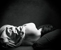Een foto uit een serie van drie. Zwart-wit, gelaagd met een grove korrel.