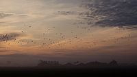 Vogels vliegen over een boerderij in de ochtend in Nederland