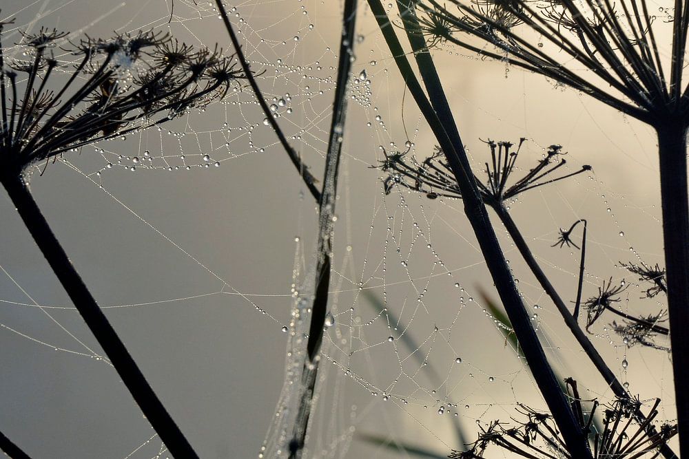 Mooie detailopname met opgaande zonlicht met een berenklauw geraamte met spinnenweb en dauwdruppels