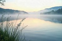 De foto toont een schilderachtig meer in de vroege ochtenduren, gehuld in zachte mist. Het wateroppervlak is zo glad als een grote zilveren spiegel en weerspiegelt de zachte pastelkleuren van de lucht, die gestreept is met delicate tinten roze en lichtblauw. Een fijne ochtenddauw ligt over het wateroppervlak, glinsterend als glinsterende parels en verlicht het frisse groen van de naburige planten. Op de achtergrond zijn glooiende heuvels te zien die het rustige landschap afronden en een sfeer van rust en ernst creëren. De foto straalt een gevoel van rust en vernieuwing uit, ideaal voor een perfect begin van de dag.