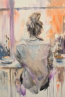 Een schilderij van vrouw die rustig uit het raam kijkt met een kop koffie en gebakje naast zich. De warme, zachte paarse en oranje kleuren van het ochtendlicht en vloeiende penseelstreken geven een gevoel van sereniteit en introspectie, perfect voor een moment van ochtendrust.