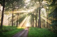 Morning Radiance' vangt het eerste licht van de dag als het door het bladerdak van het bos valt en het pad voor ons in een warme, gouden gloed baadt. De zonnestralen breken door de bomen en creëren een dynamisch lichtspel dat de kijker uitnodigt om deze rustige bosgezichten binnen te stappen.