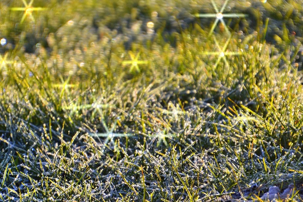 Ochtenddauw tegen de achtergrond van zonsopgang geeft aanleiding tot kleine sterren