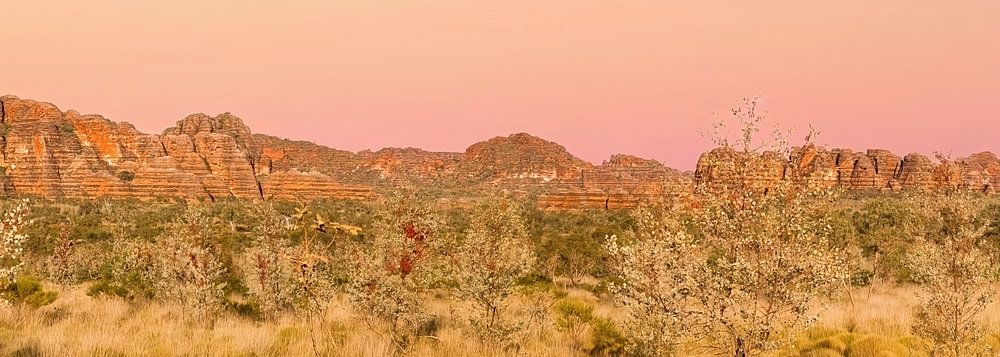 In het hart van de Australische outback rijzen de Bungle Bungle-formaties op uit het landschap als fossiele kathedralen van zandsteen. Terwijl de zon het land voorzichtig wakker kust, vangen de lagen van steen het eerste licht. Dit moment, vastgelegd in stilte, getuigt van miljoenen jaren aardgeschiedenis en de verstilde kracht van het landschap.