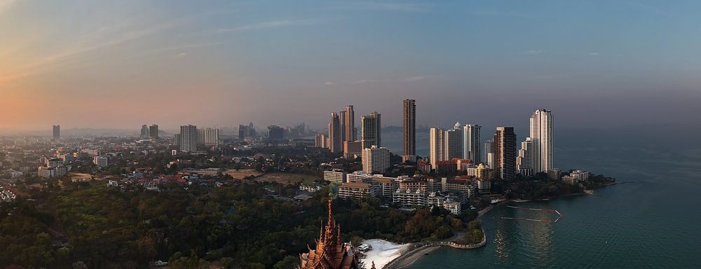 Deze prachtige luchtfoto, genomen in de vroege ochtenduren, toont een serene zonsopgang boven Pattaya met de indrukwekkende Sanctuary of Truth op de voorgrond. Het zonlicht weerspiegelt goud op het water, terwijl de stad langzaam ontwaakt. De uit hout opgetrokken tempel, gelegen aan de kust van Naklua, springt in het oog als spiritueel en architectonisch meesterwerk. Op de achtergrond verrijzen moderne wolkenkrabbers langs de kustlijn, wat een krachtig contrast vormt met het traditionele silhouet van het heiligdom. De sfeer is rustig, bijna magisch — een zeldzaam moment van stilte in een levendige stad.