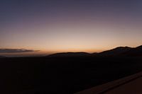 De horizon ligt ongeveer halverwege op de foto. De onderkant is vrijwel helemaal zwart, met heel licht de contouren van de duinen die daar liggen, omdat er nét een beetje licht op valt.