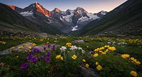 Het vlak op de voorgrond bloeit in levendig paars, wit en goud en vormt een levendig kader voor de groene vallei. Zachte heuvels en verspreide rotsen geven diepte en natuurlijke structuur aan de foto. Het oog dwaalt van de weelderige flora naar de steile hellingen voordat het blijft hangen op de gloeiende toppen. Een samenspel van kleurintensiteit en schilderachtige rust dat elke kijker boeit.