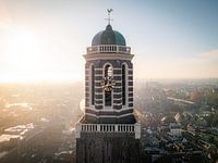 Deze betoverende foto toont de iconische Peperbus van Zwolle in het zachte, gouden ochtendlicht. De eerste zonnestralen breken door de nevelige stad, waardoor een dromerige sfeer ontstaat die de eeuwenoude toren nog majestueuzer doet lijken. De Peperbus, hét symbool van Zwolle, staat centraal en straalt rust, kracht en geschiedenis uit. Rondom ontvouwt zich een tapijt van oude straatjes, daken en kerktorens, die langzaam ontwaken onder de opkomende zon.