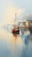 Minimalistische impressie van een windstille ochtend in een haven in de stijl van Willem Haenraets.