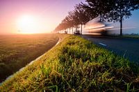 Hollands gloren op zijn best. Een mooie mistige plattelands zonsopkomst met voorbij rijdend verkeer.
