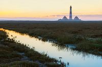 De vuurtoren van Westerhever kort voor zonsopgang. De lucht is bijna onbewolkt en baadt in pastelkleuren. Op de voorgrond wordt de hemel weerspiegeld in een gracht.
