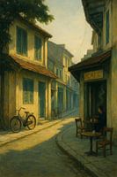 In de vroege stilte van de oude wijk van Hanoi zit een man rustig buiten een klein café, zijn koffie dampend in de zachte ochtendlucht. Twee fietsen leunen tegen zonverlichte muren, hun schaduwen strekken zich uit over de versleten kasseien. Het gedempte palet van geel en groen weerspiegelt het patina van de tijd, de verbleekte schoonheid van Franse koloniale gevels.