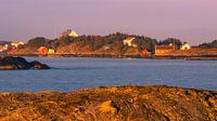 Het kleine dorpje Karvag tijdens zonsopgang, gelegen op een archipel in Eide en Averoy in More og Romsdal, Noorwegen .
