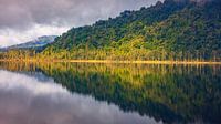 Ochtendlicht bij Lake Wahapo nabij Whataroa met kahikatea-bos in Westland National Park aan de westkust op het zuidereiland van Nieuw-Zeeland.
