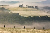 Ochtendlicht met mist over de velden bij "Cappella della Madonna di Vitaleta", in het hart van Toscane, gelegen tussen Pienza en San Quirico in de Val d'Orcia in Midden-Italië.