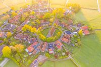 Luchtfoto van het dorpje Niehove in de provincie Groningen. Duidelijk zichtbaar de karakteristieke cirkelvorm van het dorp met centraal het 13e eeuwse kerkje van Niehove