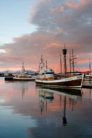 Rood ochtendlicht in de haven van de Noord-IJslandse stad Husavik, schepen weerspiegeld in het water, wolken in rode tinten in de lucht, bergketen met sneeuw op de achtergrond - locatie: IJsland, Noordkust, Husavik (Húsavík)