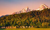 Ochtendlicht in het Berchtesgadener Land, nabij Berchtesgarden met blik op de Watzmann, het centrale bergmassief van de Berchtesgadener Alpen, in Beieren, zuid Duitsland.