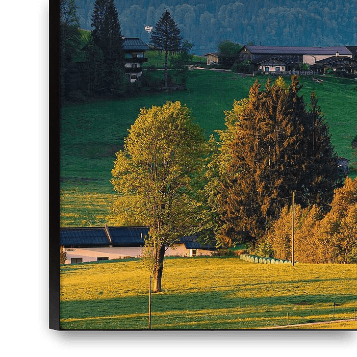 Voorjaar, en warm ochtendlicht valt over het landschap in Beieren, Zuid Duitsland in het Berchtesgadener Land.