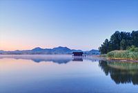 De foto toont een eenzaam boothuis aan de oever van de Chiemsee, in een vredig en idyllisch landschap. Het kleine, houten gebouw staat op palen die iets uitsteken in het heldere, kalme water van het meer. De verweerde houten balken en het eenvoudige dak van het boothuis stralen een rustieke charme uit en passen perfect in de natuurlijke…
