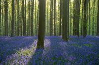 Dit sfeervolle natuurfoto toont het Hallerbos – ook wel het “Blauwe Bos” genoemd – op zijn allermooist tijdens de bloei van de wilde hyacinten in het voorjaar. Vroege zonnestralen filteren zacht door het bladerdak van de hoge beuken, waardoor een betoverend lichtspel ontstaat. De bosgrond is bedekt met een intens paarsblauw bloementapijt, wat de scène een bijna sprookjesachtige uitstraling geeft. Deze foto is genomen tijdens het gouden uur bij zonsopgang, wat zorgt voor een warme gloed en mooie dieptewerking in het beeld. Het Hallerbos, gelegen in België, is wereldwijd bekend en trekt elk jaar natuurliefhebbers en fotografen die deze korte, magische bloeiperiode willen vastleggen. Dit kunstwerk brengt rust en sereniteit in elke ruimte – perfect voor een woonkamer, kantoor of wachtruimte. Een tijdloze natuurafbeelding die de schoonheid van de lente viert en elke dag een stukje stilte en verwondering in huis brengt.