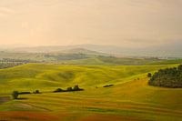 Een nevelige ochtendmist hangt boven de glooiende heuvels van Val d'Orcia in Toscane, Italië. Het is het begin van wat een warme dag gaat worden. Rode bloemen groeien tussen het gele graan.