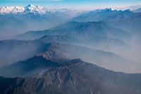 Gefotografeerd vanuit het vliegtuig, op weg naar de Himalaya. Je ziet de besneeuwde toppen liggen in de verte. De nevel geeft een mysterieuze sfeer aan de foto.