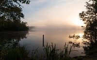 Een prachtig doorkijkje over het Belversven, De zonopkomst is net bezig en probeert de mist boven het ven te laten verdwijnen.