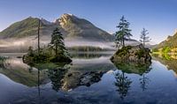 De bergtoppen van de Beierse Alpen worden kort na zonsopgang weerspiegeld in de idyllische Hintersee in het Berchtesgadener Land.
