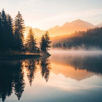 Zachte nevelflarden dansen over het spiegelgladde water, terwijl de eerste zonnestralen de bergtoppen in goudkleurig licht baden. Majestueuze dennenbomen met schaduwrijke silhouetten omlijsten het landschap en creëren een harmonieuze verbinding tussen hemel en aarde. Een plek waar vrede en schoonheid in perfecte harmonie bestaan.