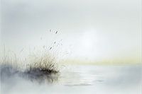 Aquarel van een mistige ochtend vanaf de oever van een meertje of ven. De ochtendzon probeert door de mist te komen. Deze minimalistische opzet geeft de compositie een ruimtelijk gevoel en trekt de aandacht naar het bosje riet links. De nevel en het magere zonnetje zijn goed gevangen en dit werk zal goed staan in zowel een moderne als…