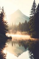 Als een kostbaar geheim daalt de ochtendnevel zachtjes neer over het rustige meer, terwijl de eerste zonnestralen het silhouet van de majestueuze berg omarmen. Donkere, trotse dennenbomen rijzen op, weerspiegelingen in het water fluisteren van de ongerepte natuur en nodigen je uit om te genieten van de stilte in al haar pracht. Een magisch moment waarin de wereld lijkt te pauzeren.