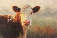 In dit werk staat een nieuwsgierige koe centraal, badend in het warme ochtendlicht. Haar vacht vangt de zon, terwijl de achtergrond vervaagt in zachte nevel. De blik van het dier is oprecht, bijna alsof ze de kijker even aankijkt en een moment van herkenning biedt.