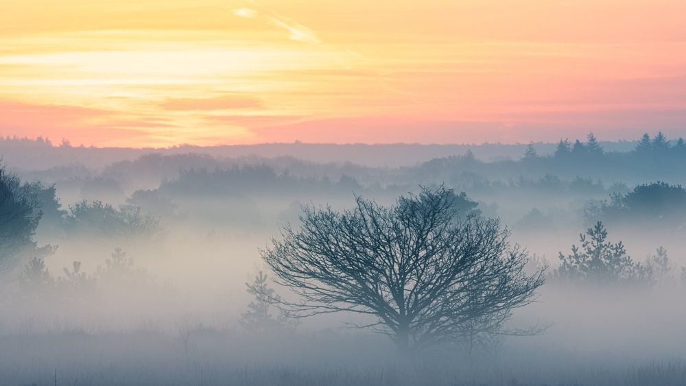 Op de heide hangt veel nevel tussen de bomen, het gras en de heidplanten. Dit geeft een kalme en mysterieuze sfeer aan het heideveld. Zo'n moment duurt altijd maar even. Een half uur later is alle nevel verdwenen.