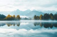 Een zachte mist hangt over het glinsterende water, terwijl majestueuze bergen opdoemen op de achtergrond. De levendige kleuren van de herfstbladeren worden perfect weerspiegeld in het kalme oppervlak, alsof de natuur een betoverend schilderij heeft gemaakt. Dit harmonieuze landschap nodigt uit tot contemplatie en dromerig verwijlen.