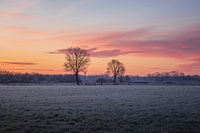 Op de foto zie je een winters polderlandschap met een groot veld bedekt met ochtendrijp die glinstert in het zonlicht. In de verte staan twee alleenstaande bomen, hun kale takken steken af tegen de roze lucht die verlicht wordt door de opkomende zon. De sfeer is kalm en vredig, en het lijkt alsof de natuur langzaam ontwaakt uit de koude nacht.