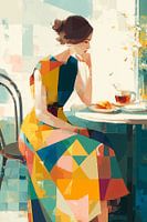 Een modern geometrisch kunstwerk dat een verstild moment in een café vastlegt. De figuur in een kleurrijke jurk met geometrische patronen zit aan een klein tafeltje met thee en gebak. Het kunstwerk combineert warme gele en oranje tinten met diepe turquoise accenten in een kubistische stijl, wat resulteert in een sfeervolle compositie die nostalgie en moderniteit vermengt.