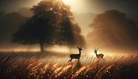In een veld dat oplicht in het eerste licht van de dageraad, huppelen twee herten door de hoge, met dauw doordrenkte weide. De zachte stralen van de opkomende zon schilderen een sluier van licht en schaduw over het landschap, terwijl de mist langzaam de grond streelt. Een enkele, majestueuze boom staat op de achtergrond, gekroond door…