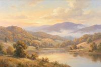 Een sfeervol, geschilderd landschap waarin de eerste zonnestralen zacht over glooiende heuvels glijden. De warme gloed van het ochtendlicht weerspiegelt op een kalm meer, terwijl in de verte nevel tussen de bergen hangt. Zachte penseelstreken en subtiele texturen geven dit kunstwerk een klassieke, bijna tijdloze uitstraling. Een…