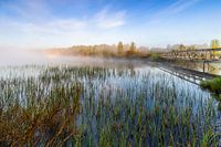 s Ochtends bij een meer in Zweden waarover een houten brug leidt.