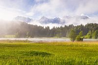 De zon verdrijft de dichte mist en onthult het uitzicht op het Karwendelgebergte.