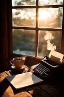 Sfeervol licht stroomt door het open raam en omarmt de vintage typemachine, terwijl de dampende koffiemok op de houten tafel een gezellige sfeer creëert. Een lege pagina wacht om gevuld te worden met gedachten. Perfect voor een creatief kantoor of een inspirerende schrijfruimte waar ideeën kunnen opbloeien in de zonnestralen.
