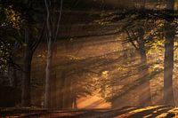 Als je op een mistige of nevelige ochtend in het bos loopt en de zon komt er door, ontstaan er prachtige zonnestralen of zonneharpen in het bos. Op deze foto zie je wat voor sfeer dat oplevert. Vooral door de warme kleuren van de ochtendzon en het contrast met het donkere bos ontstaat er een prachtig sfeervol beeld. Om dat vast te kunnen leggen is altijd weer een voorrecht!