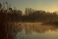 Dit is de grote rietplas bij Emmen. Zon en mist brengen altijd sfeer in een foto. Wat mooier is vervolgens de beleving dat er ook nog een aantal ganzen je beeld in zwemmen. Hier word ik altijd stil van en probeer dit moment dan ook zo lang mogelijk vast te houden.