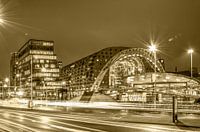 Een monochroombeeld in sepiatinten, gemaakt tijdens ochtendspits op de Blaak in Rotterdam. Centraal in beeld de wereldberoemde Markthal, rechts daarvoor trein-