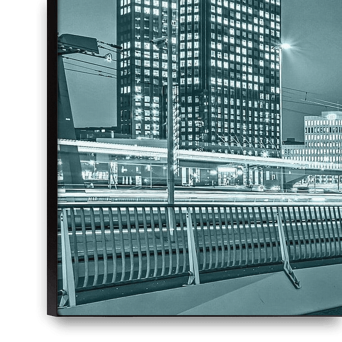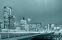 Een monochroombeeld in koel blauwgrijs, met zicht vanaf de Erasmusbrug op het Wilhelminaplein op de Kop van Zuid in Rotterdam. Met links het hoogste gebouw van Nederland: de Maastoren. In het midden het gerechtsgebouw en rechts het Nieuwe Luxortheater.