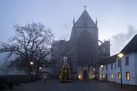 Panoramisch uitzicht op de Dom van Altenberg bij zonsopgang op een koude winterdag in de kersttijd met kerstboom, Odenthal in het Bergisches Land, Noordrijn-Westfalen, Duitsland