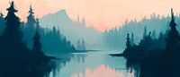 Een betoverende ochtend in het bos, waar zachte nevelsluiers dansen over glinsterend water en majestueuze bergen bloeien op de achtergrond. Dit harmonieuze tafereel met rustgevende blauwe tinten en delicate pasteltinten creëert een vredige sfeer - perfect voor een slaapkamer of een rustig leeshoekje in de woonkamer.